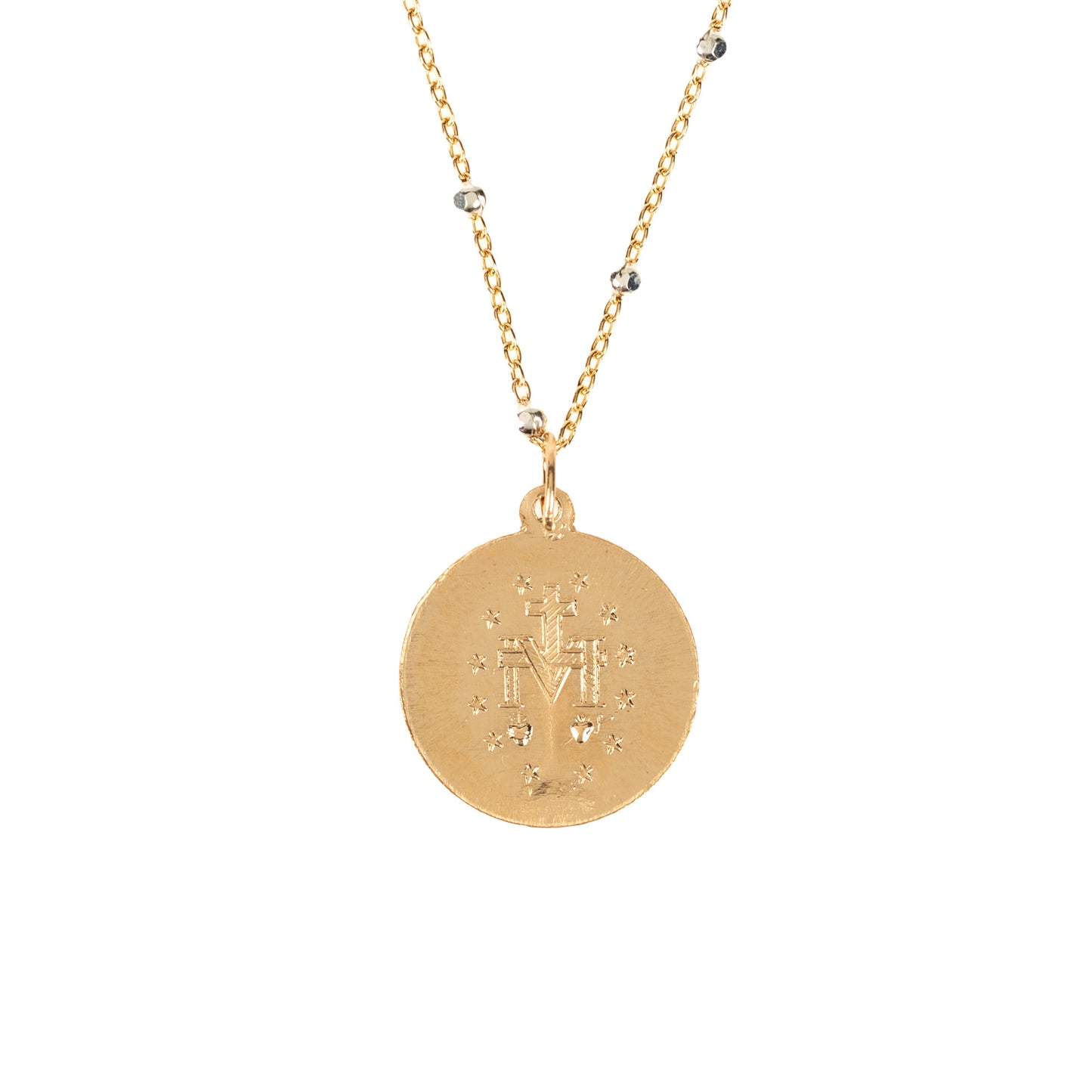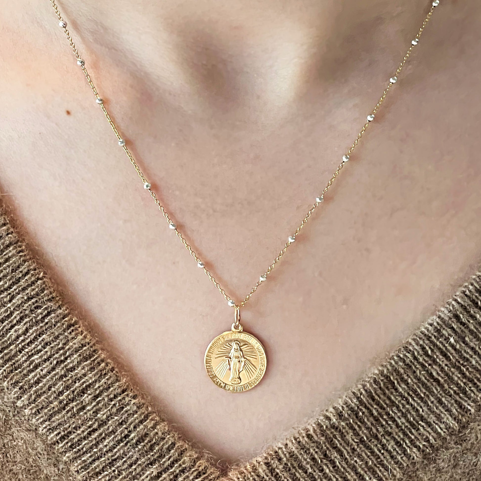 The round medal showcases a more modern design, hanging gracefully from a golden rolo chain adorned with petite, faceted gold beads that add a soft, feminine touch and refined elegance.