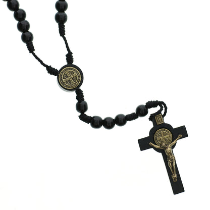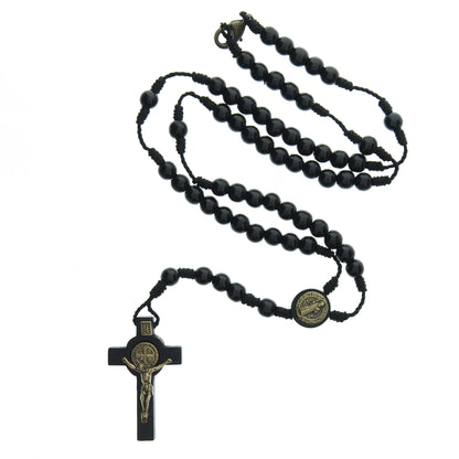 Corded rosaries are pleasing to the hand and are wonderfully durable. This St. Benedict corded rosary features smooth, round wood beads snuggly strung together, and has a gorgeous wood cross with a bronze-toned corpus and St. Benedict medal. It is uniquely designed with a clasp in the middle of the third decade.