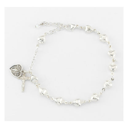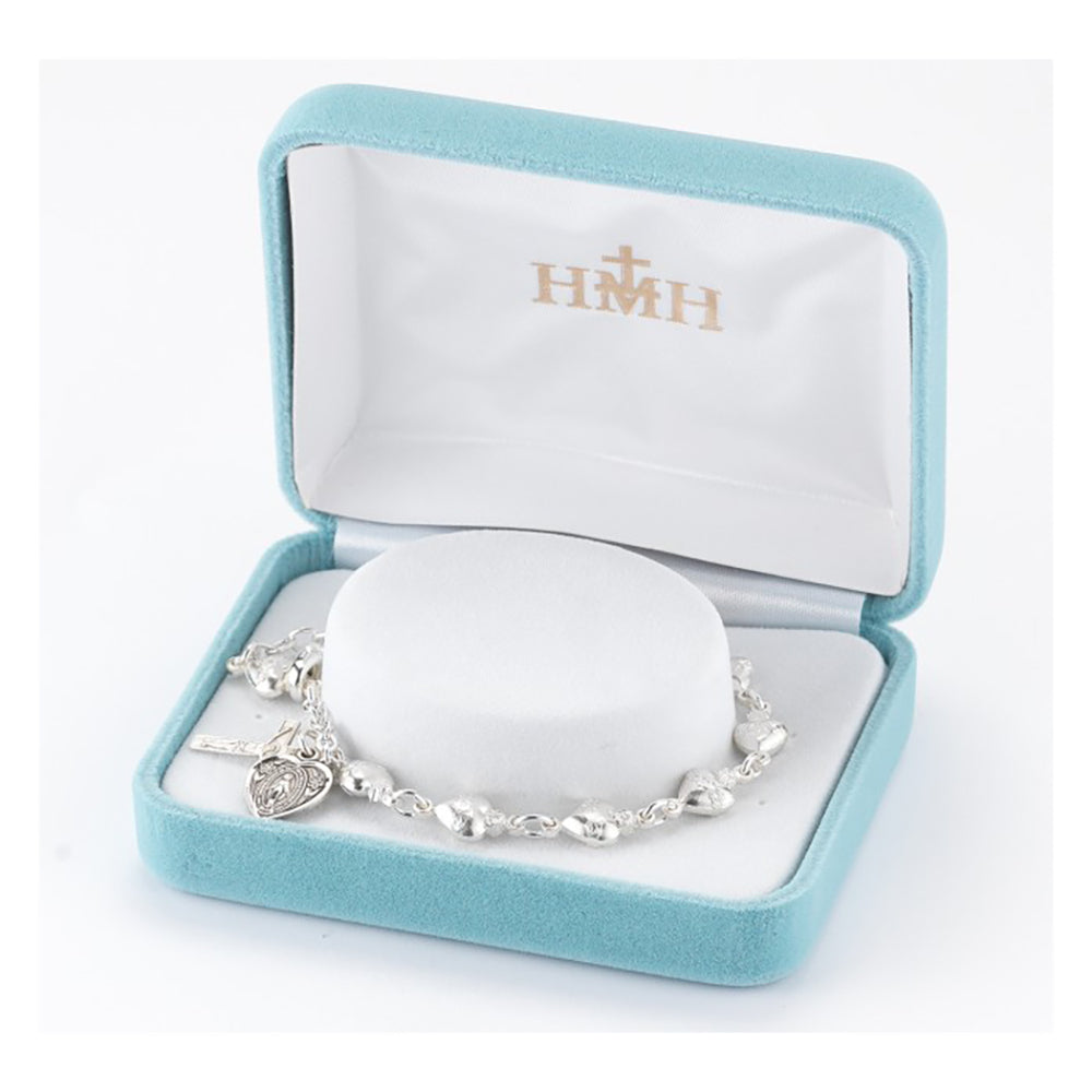 Sterling Silver Sacred Heart beads in fine detail are gracefully connected by a sterling wire chain in this gorgeous heirloom quality rosary bracelet. The single decade bracelet also contains a petite Crucifix and Miraculous Medal charm, as the finishing touch.