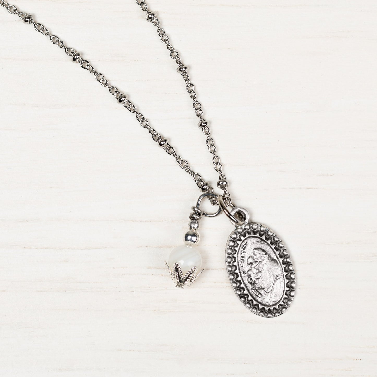 St. Anthony was a gifted preacher and is beloved as an intercessor for finding lost things. The Italian medal on this lovely necklace shows St. Anthony lovingly holding the Christ Child in his arms. Next to the medal is a small mother of pearl bead. The relatively small size reminds us of how St. Anthony was always humbling himself for God, and how he spent his life preaching the Good News of Christ to all people. A wonderful gift for anyone with the name of Anthony, Tony, Antony, Antoinette, Toni etc., or for anyone with a special devotion to St. Anthony.