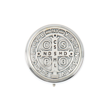 This sleek rosary container has a metal exterior with a pristine cream-colored interior. The depiction of the St. Benedict medal on the cover reminds you of St. Benedict's spiritual protection. Pair this case with a rosary to make a truly unique and special gift for a loved one. Crafted in Italy.