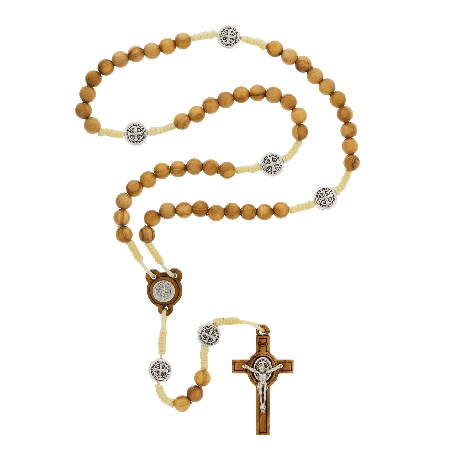 - Corded olive wood rosary with St. Benedict medals