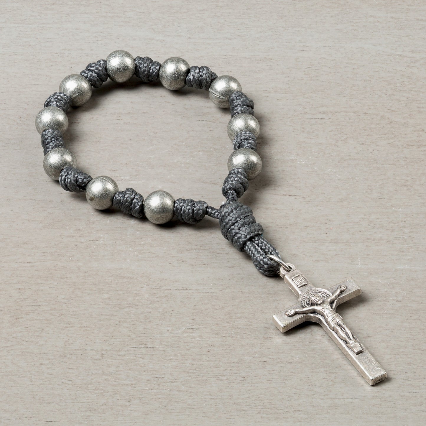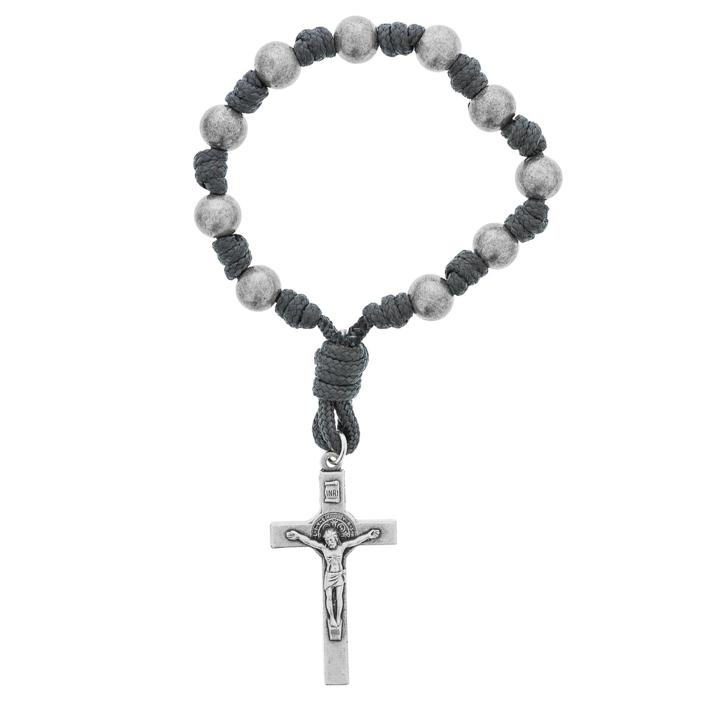 Smaller than a full size rosary, this compact pocket decade rosary features a striking St. Benedict Medal crucifix. Visible from the front and the back of the crucifix, the powerful medal makes this pocket rosary a special keepsake for anyone with a devotion to St. Benedict. The steel decade beads complement the silver St. Benedict Medal, also known as the Jubilee Medal. This sacramental is to be used to help us sanctify our lives and has many indulgences and spiritual benefits associated with it. A charcoal colored paracord holds the pocket rosary together...just like the Benedictine communities are held together with their common rule. This sturdy and durable pocket rosary can be easily slipped into your pocket and is a great companion to take with you on-the-go as a reminder of the Benedictine’s famous rule: Ora et Labora (Pray and Work).