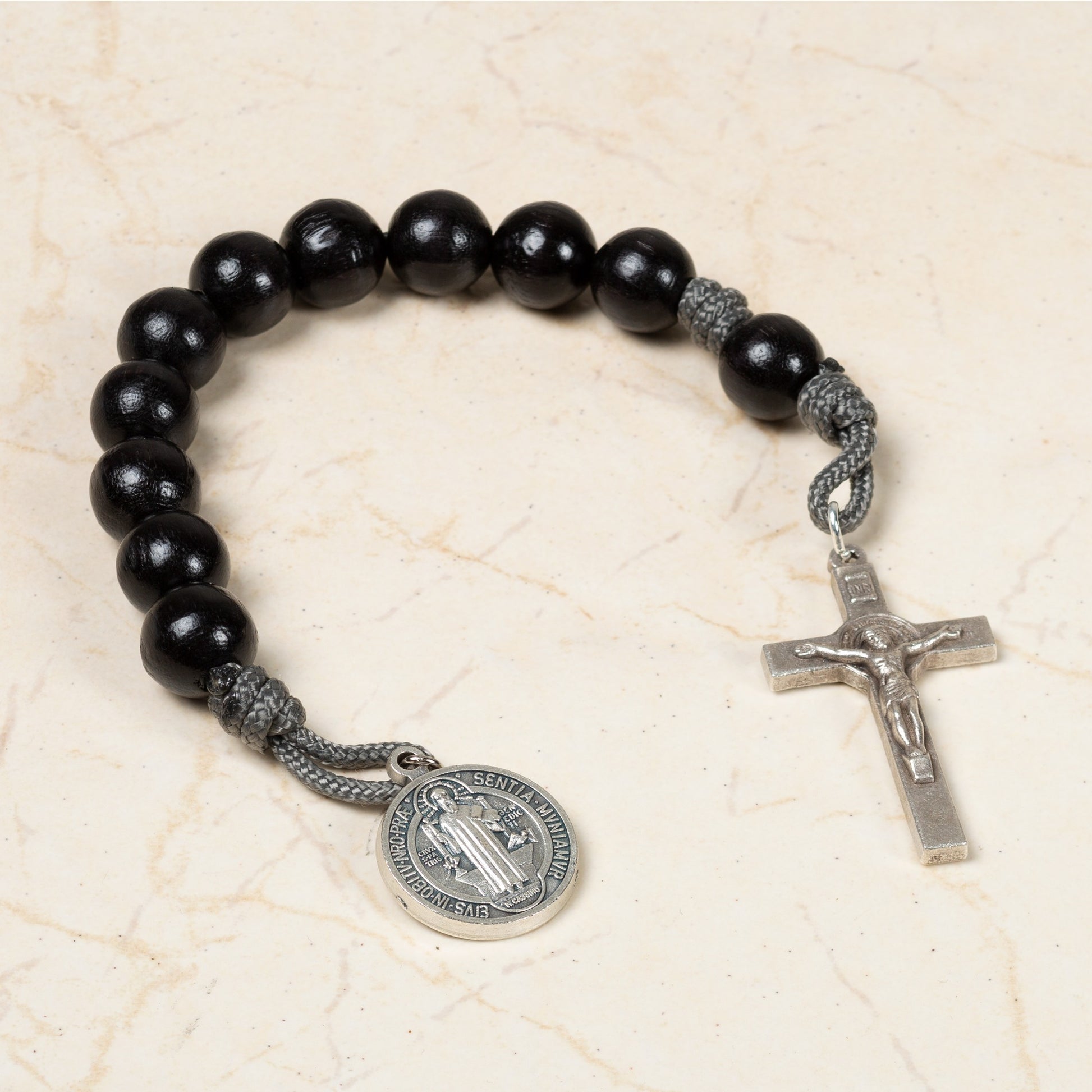 Simple and humble, just like the teachings in the Rule of St. Benedict, this tenner was made for anyone with a special devotion to St. Benedict. The crucifix on one end has a tiny St. Benedict medal at the center (also known as the Jubilee Medal). At the other end is a larger St. Benedict medal, just the right size for balancing the strand. The black wood beads bring to mind the black habits of the Benedictine monks. A charcoal colored paracord holds the tenner together...just like the Benedictine communities are held together with their common rule. Slip this tenner into your pocket to take with you on-the-go and as a great reminder of the Benedictine’s famous rule: Ora et Labora (Pray and Work).