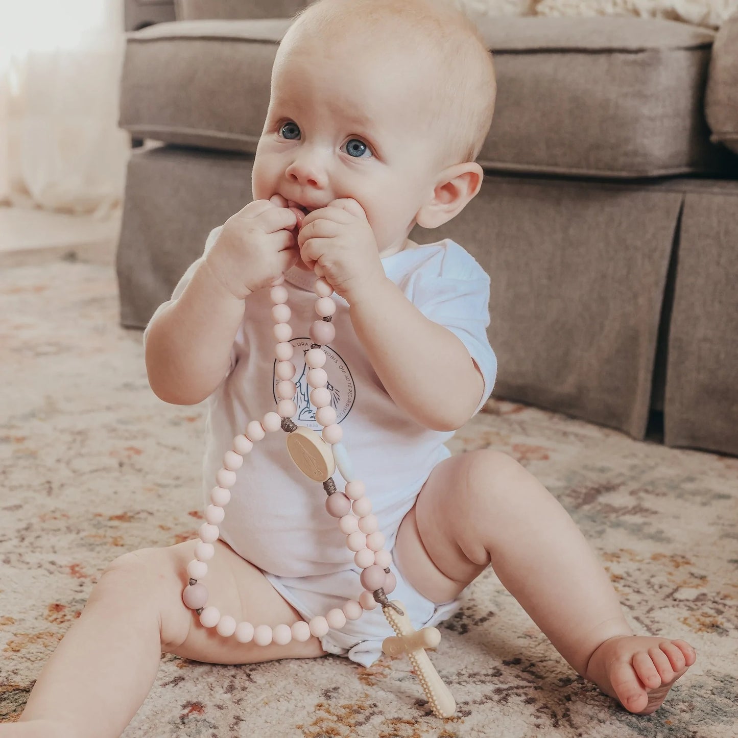 This chewy, textured rosary helps teach your children that the Rosary soothes and provides relief in all of life's trials, from teething all the way to adulthood. With pastel pink, purple and white chewy beads, it makes a toy and object of comfort to very young children who are teething. It features a nubby, textured teething Cross, and it can grow with your child to become a special object of comfort they use for years to come.