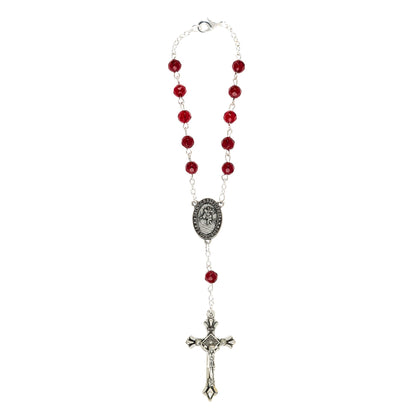 This auto rosary features ten garnet beads connected with a silver chain, highlighted by a St. Christopher medal. With an elegant silver crucifix, it makes a fantastic gift for a new driver.