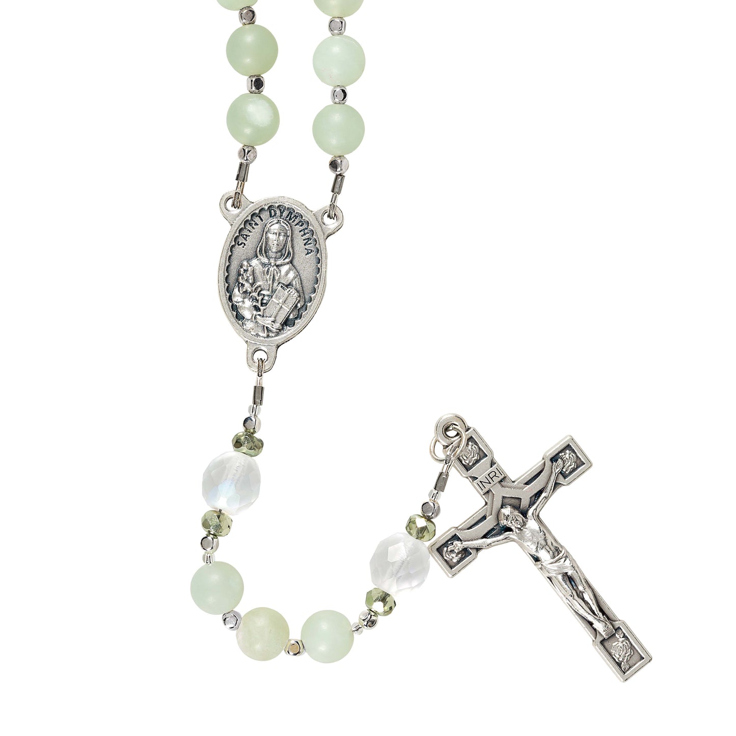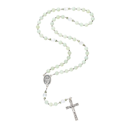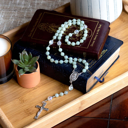 Pale, matte jade Hail Marys represent the renewal and growth possible through Christ. Silver crystal seed beads and mint fire polished crystals provide variety and movement. The finishing touches are a centerpiece featuring the Saint, and a rose detailed Crucifix, a reminder of theĀ Crown of Thorns, both made in Italy.Ā