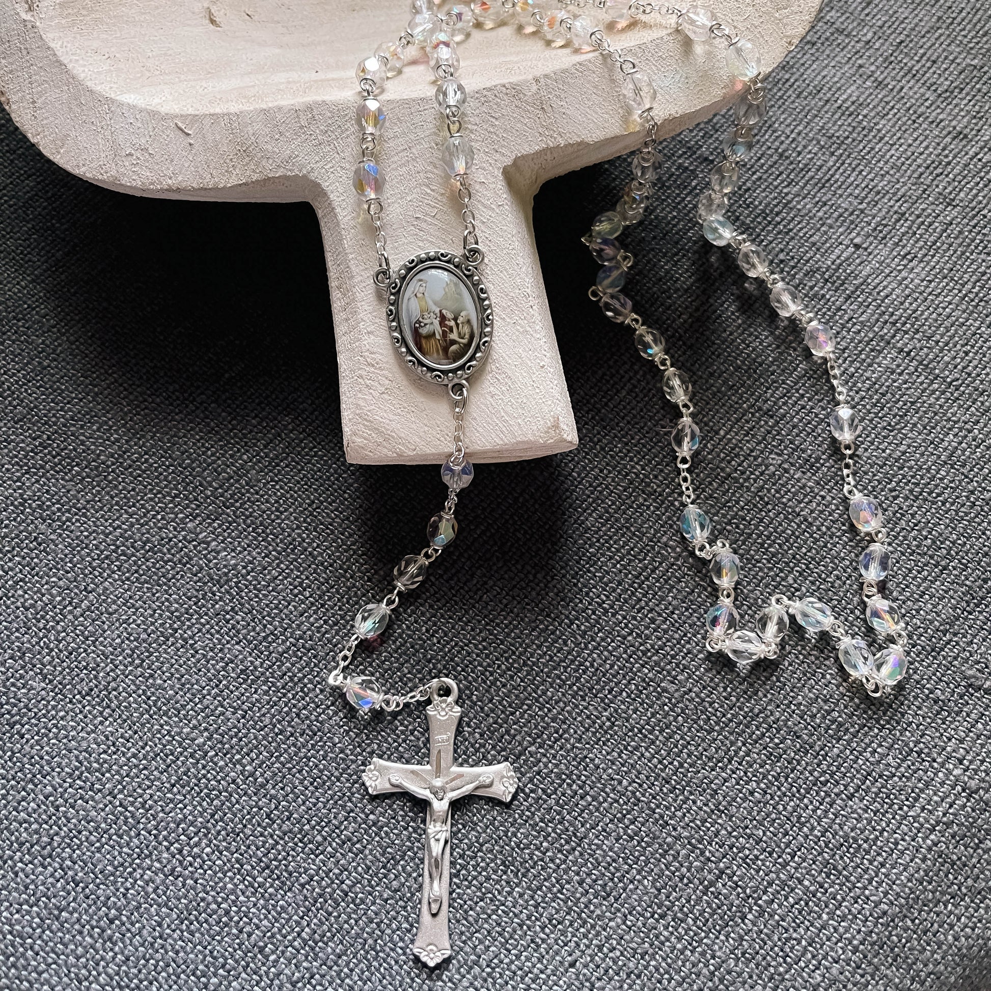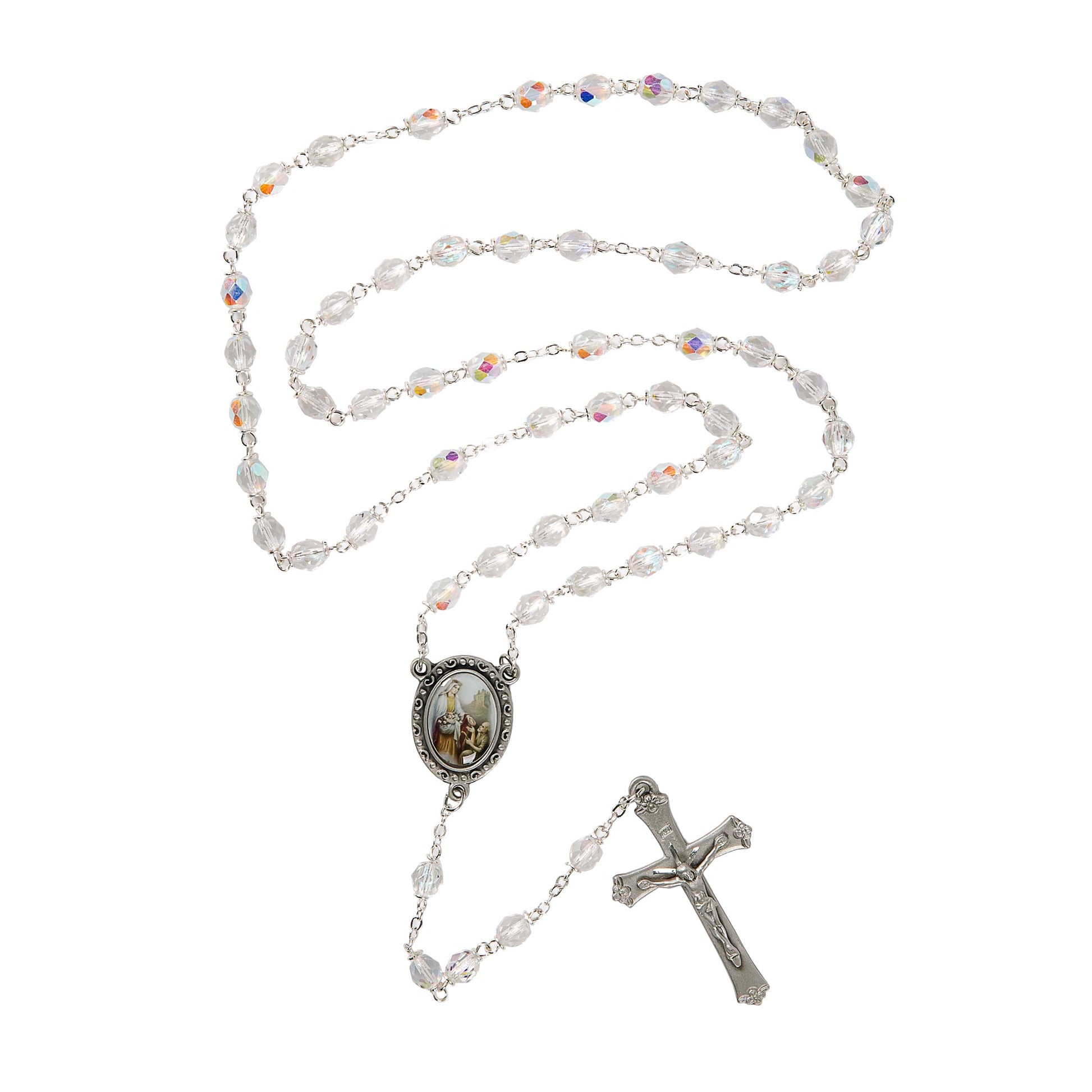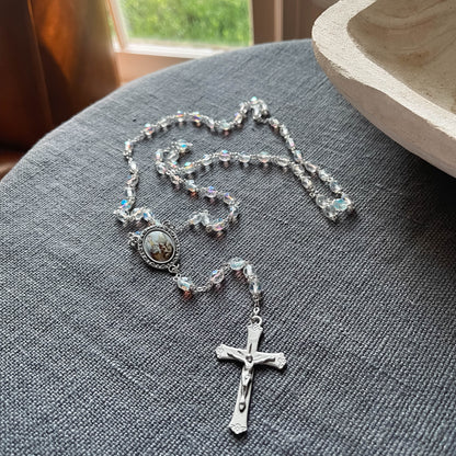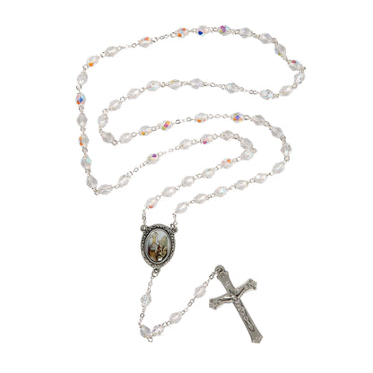 A rosary to honor St. Elizabeth of Hungary, Patron Saint of Bakers, Nursing Homes, Brides & Beggars. Crystal clear, faceted beads gleam on a silver tone chain, accompanied by a centerpiece medal with a full-color image of St. Elizabeth as she distributes bread to the poor. The finishing touch is a Crucifix decorated with dainty flowers at the tips. Gift boxed for presentation.