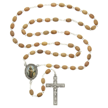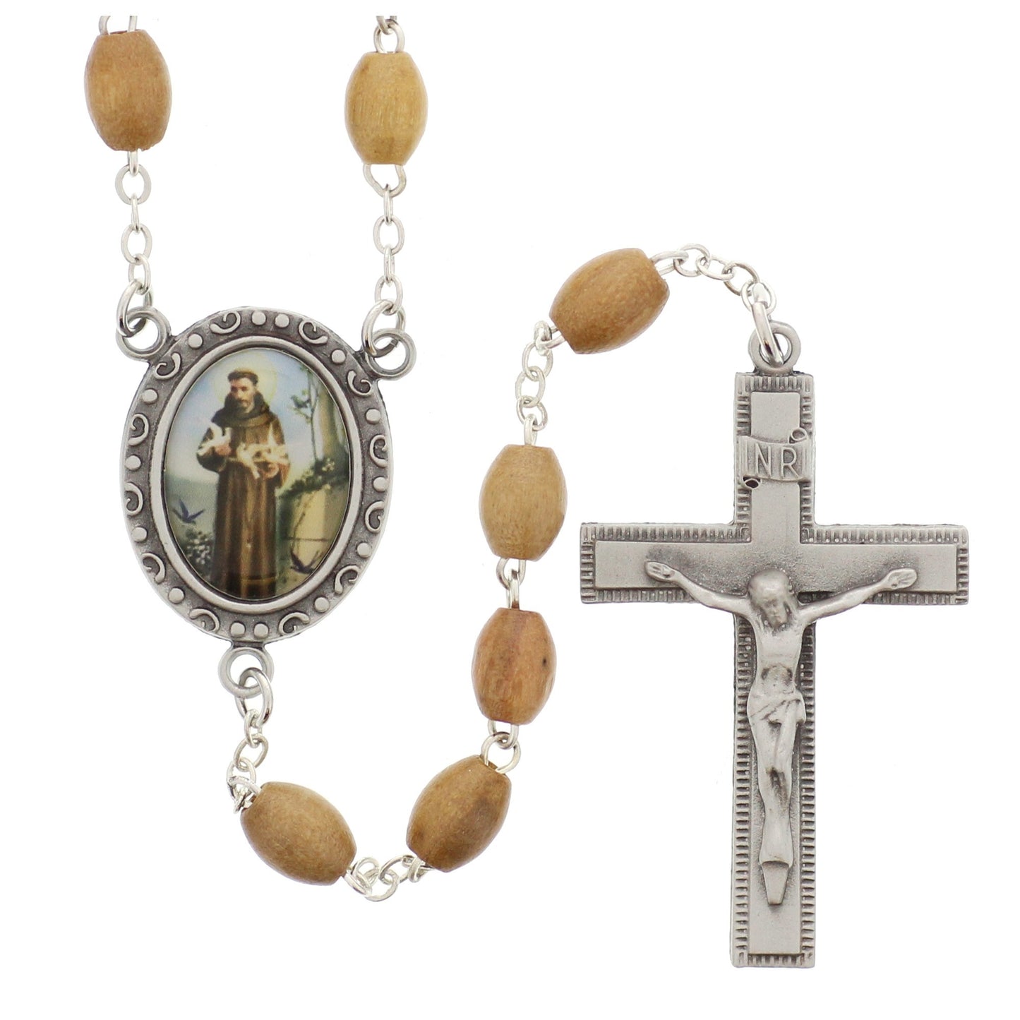 This rosary has a masculine flare with its natural wooden beads, which are oblong, smooth, light wood polished gently and carefully. It features a silver tone chain, simple Crucifix with hatched border, and a centerpiece that is a full color depiction of St. Francis. A simple yet handsome rosary that reflects St. Francis and his spirituality. Makes a wonderful aid to prayer and a meaningful gift of faith. Gift boxed for presentation.