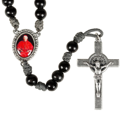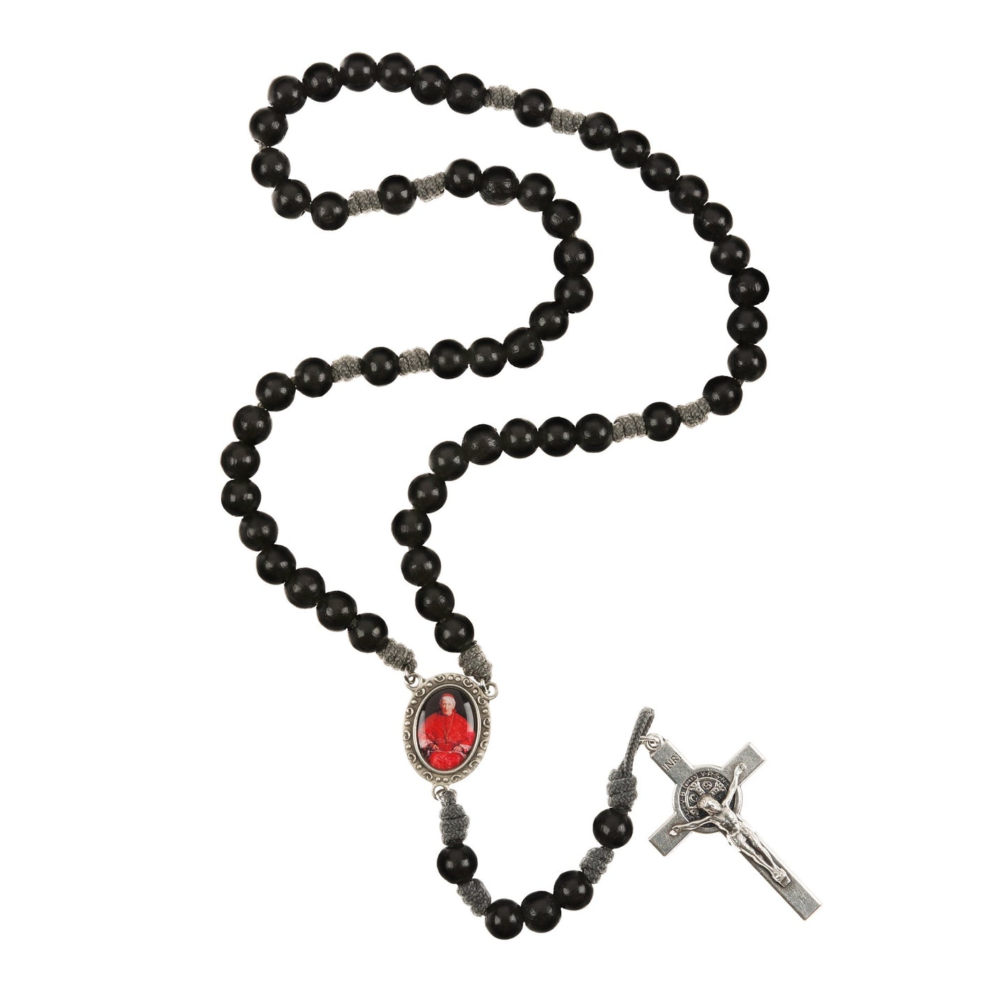 This black and gray paracord rosary is a durable yet lightweight rosary for everyday use. The black wood beads are glossy and smooth, and the paracord string make for a flexible rosary. The St. John Henry Newman centerpiece features an enameled print of the cardinal, and is surrounded by a filigree border. The Italian-made St. Benedict crucifix completes the rosary with its powerful reminder of Christ's promise of victory over the enemy. A unique gift for a man, especially a seminarian, priest, or other servant of the Church.