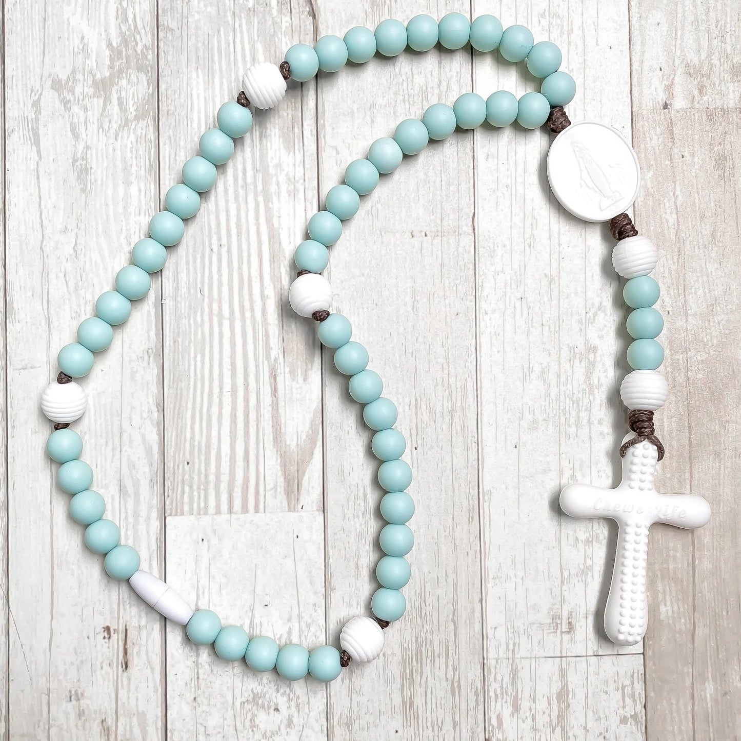 This chewy, textured rosary helps teach your child that the Rosary soothes and provides relief in all of life's trials, from teething all the way to adulthood. With pastel blue and white chewy beads, it makes a toy and object of comfort to very young children who are teething. It features a nubby, textured teething Cross, and it can grow with your child to become a special object of comfort they use for years to come.