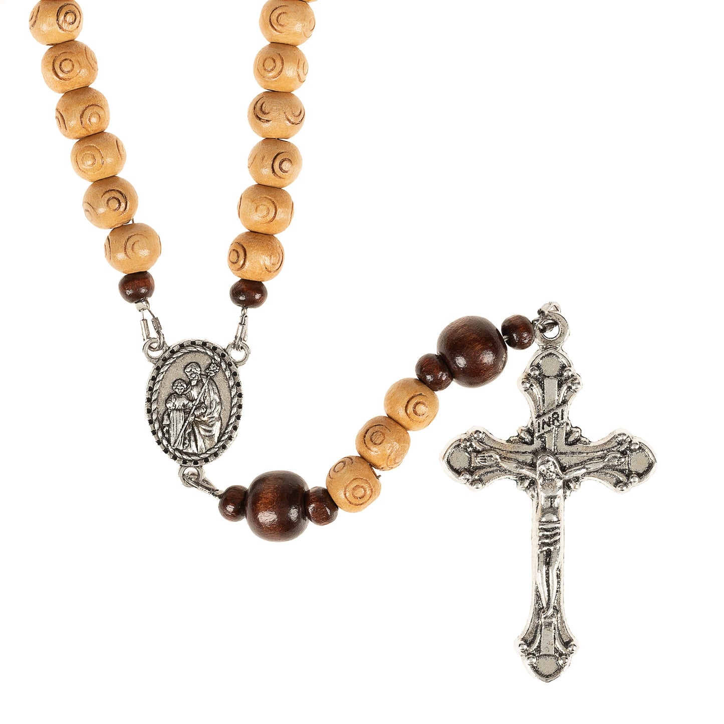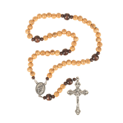 Etched wooden beads in both dark and light wood tones are polished to perfection and speak instinctively of St. Joseph the Carpenter. Modest yet intricate, they bring to mind the hardworking man who was both a simple tradesman and the privileged foster father of Jesus.