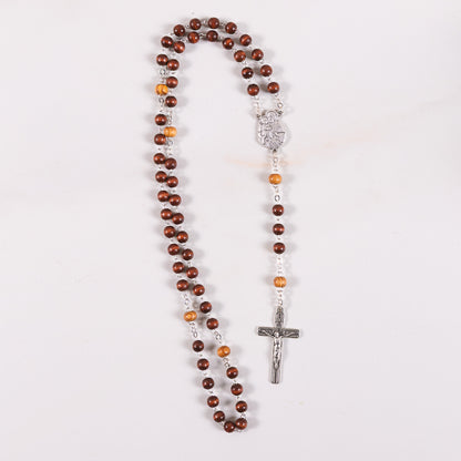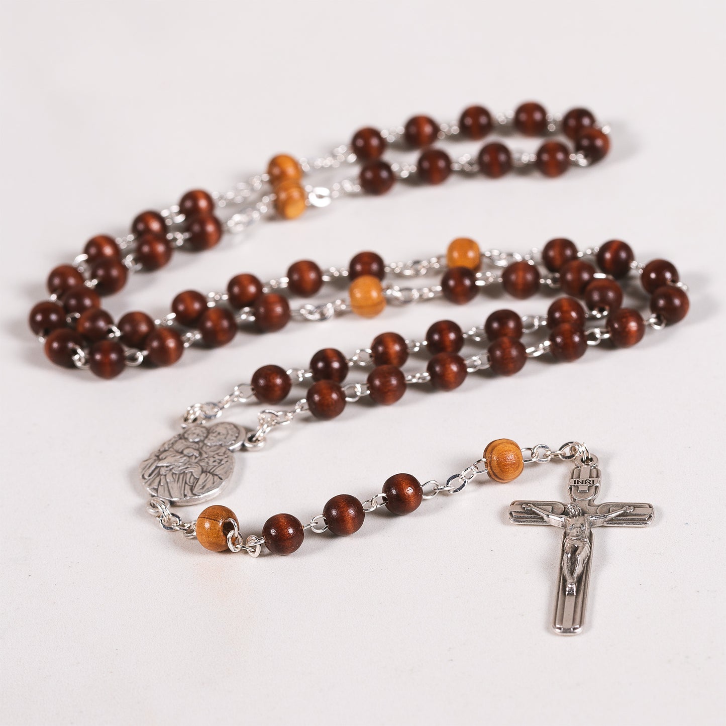 An olive wood rosary honoring St. Joseph, featuring two tone beading. Dark brown Hail Marys and light brown to natural Our Fathers compliment one another and accent a handsome St. Joseph & the Child Jesus centerpiece. The crucifix is simple and contemporary. This is a rosary for those devoted to St. Joseph, earthly father of our Lord, so powerful before the throne of God.