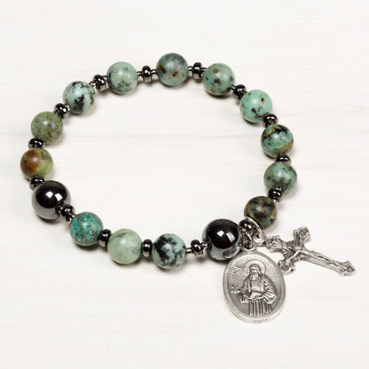 As your fingers move around the African Turquoise beads on this St. Jude rosary bracelet you will notice the variation in colors and patterns. Light and dark greens swirl together to remind us of the green cloak of St. Jude. Green is a color associated with new growth, rebirth, and renewal. It reminds us of God’s promise, “Behold, I make all things new!” (Revelation 21:5). The black and brown patches remind us to bring all of our troubles and toils in prayer to God. St. Jude has long been called upon as the patron saint of hopeless or impossible causes, however, do not view St. Jude as a sad or depressing saint - instead we call upon him with great hope! A small crucifix rests close beside the Italian medal of St. Jude holding his New Testament book The Epistle of Jude. This bracelet can be worn as an accessory or used for praying the rosary. A perfect gift for anyone facing a difficult or seemingly hopeless experience, or anyone with a special devotion to St. Jude.