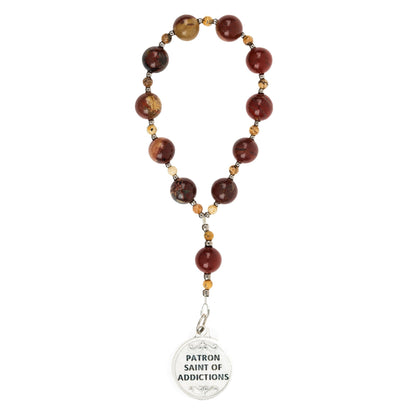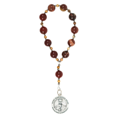Smaller than a full size rosary, this compact decade rosary features an Italian St. Maximilian Kolbe medal, patron saint for those who are struggling with addictions. As your fingers move around the mysteries you will feel the cool, soothing Jasper beads. This ancient stone is listed in the Old Testament on the “Breastplate of Judgment” (Exodus 28:17-21) and is also listed as one of the gems found in the foundations of the New Jerusalem (Revelation 21:19-20 and Isaiah 54:11). A matching prayer card includes a beautiful, moving prayer imploring St. Maximilian Kolbe’s intercession. This little decade rosary can be easily slipped into your pocket and is a great companion to take with you on-the-go as a reminder of the patronage and intercession of St. Maximilian Kolbe.
