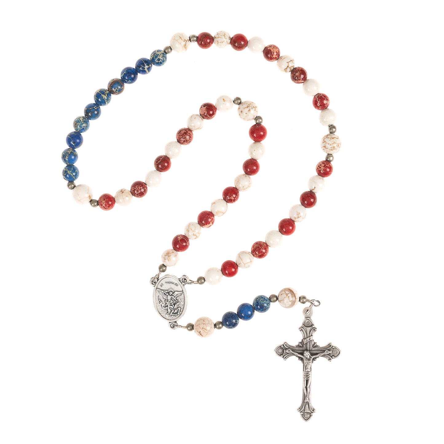 As your fingers move around the mysteries you will feel the cool, smooth Jasper beads. This ancient stone is listed in the Old Testament on the “Breastplate of Judgment” (Exodus 28:17-21) and is also listed as one of the gems found in the foundations of the New Jerusalem (Revelation 21:19-20 and Isaiah 54:11). The marbled stones remind us of the incredible history of our country. When used to represent The United States of America, the color white represents purity and innocence. Red represents hardiness and valor. Blue represents vigilance, perseverance and justice. The Italian St. Michael medal features the traditional strong stance of St. Michael as he crushes Satan. The back of the medal has the words "Pray for Us". Includes a prayer card with our original "Prayer for America".