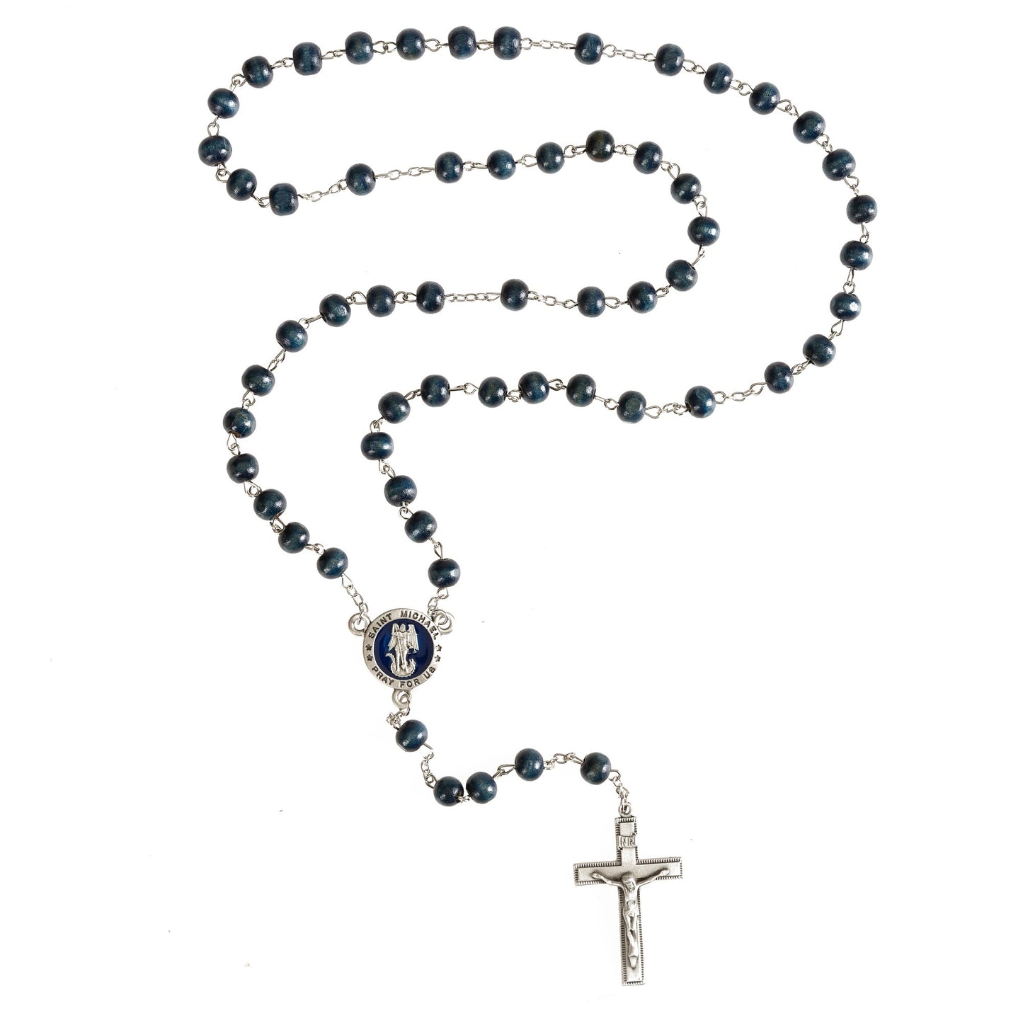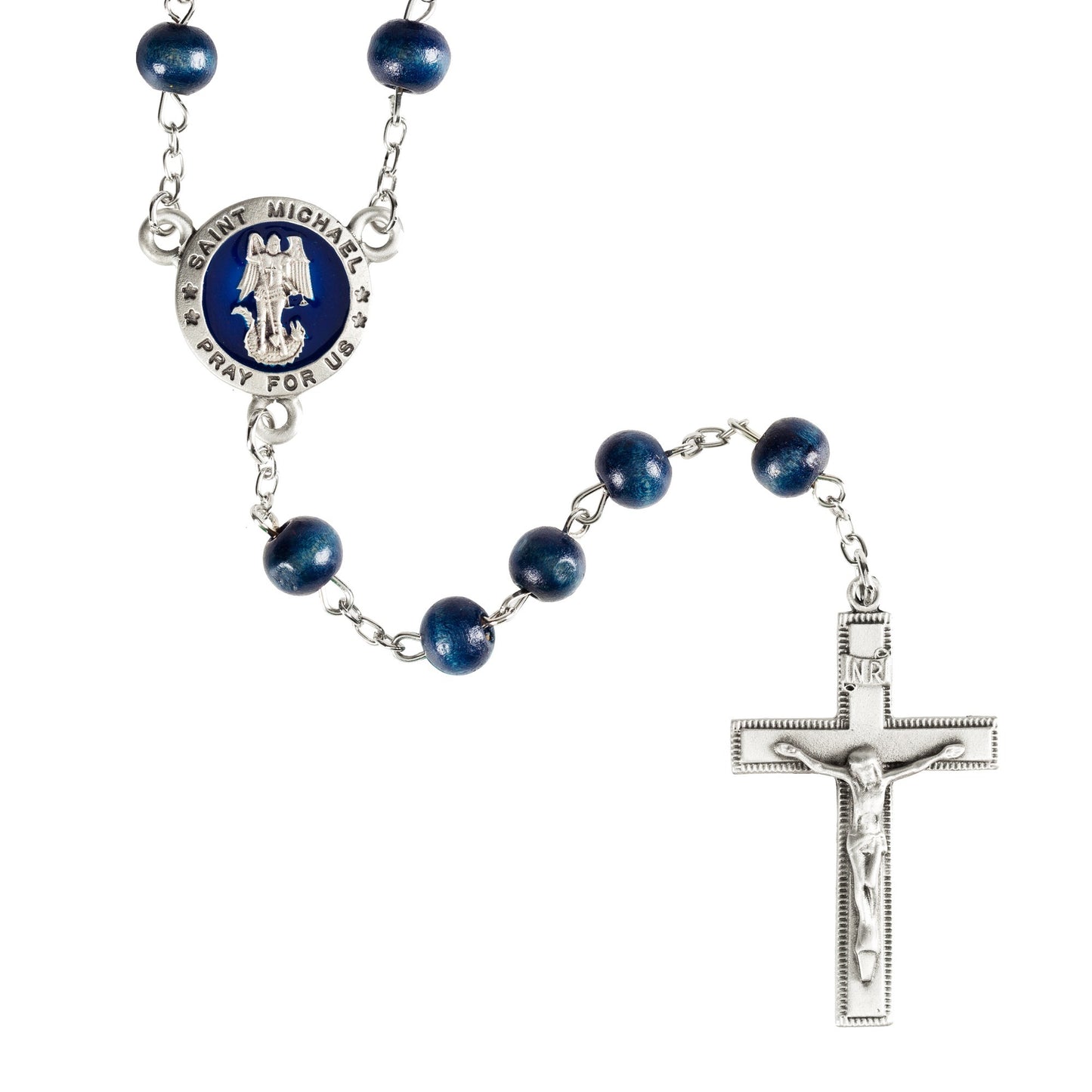 A unique pewter rosary featuring generously sized wooden beads in a rich blue tone, with a distinctive St Michael centerpiece that accents the Prince of Angels on a striking blue background. The pewter Crucifix is simple and attractive, with clean lines and a hatched outer border. Honor St. Michael on your rosary, or ask his protection and intercession over someone you love, with this faithful and lovely rosary. He is the Patron Saint of Grocers, Paramedics, Police Officers, Paratroopers & Military as well as Mariners. Deluxe gift boxed.