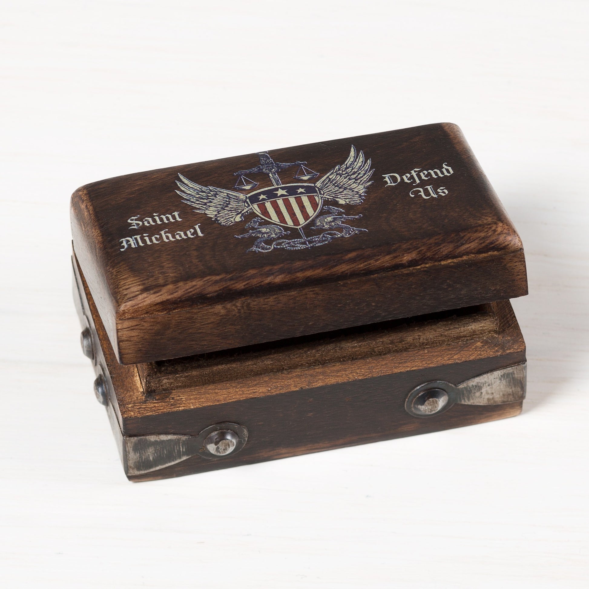 Carved from gorgeous mango wood, this box makes a perfect gift for a man's office, desk, or bedside. The top comes engraved with the prayer "St. Michael, Protect Us", and a full color crest symbolizing the archangel saint. The antiqued metal accents and hinges give this Catholic Company exclusive box a particularly rustic feel.