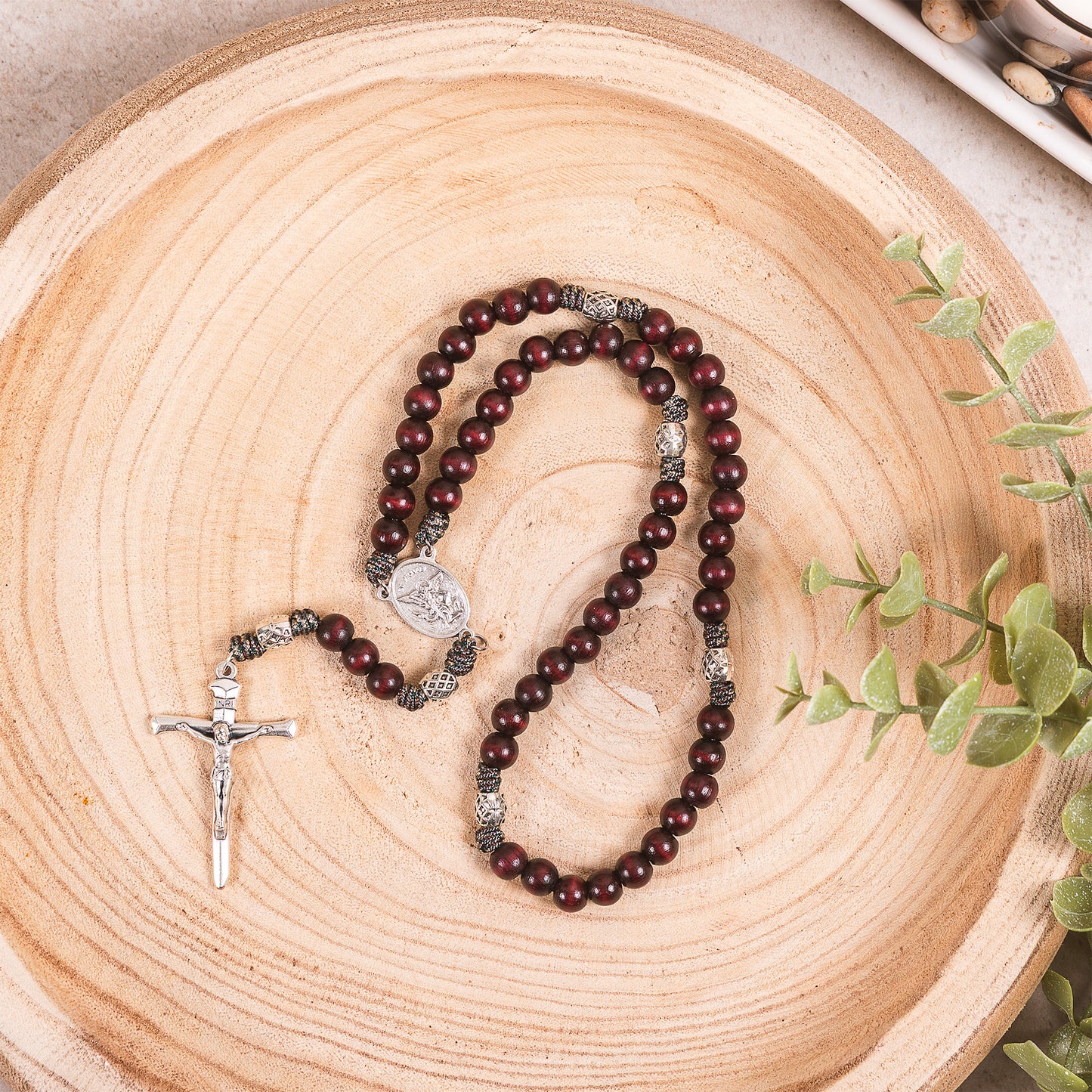 The strength and power of St. Michael is reflected in a rosary made for courage and confidence in God. Warm Mahogany Legno Tondo Our Father beads set off intricate pewter barrel beads with hatched detailing. The rich wood beads represent the fruitfulness of loyalty and obedience to God, the liberation and transformation of our natures into something more. Intricate metal beads symbolizes strength, power and glory in the battle cry of St. Michael and every Catholic, "Who is like unto God?"