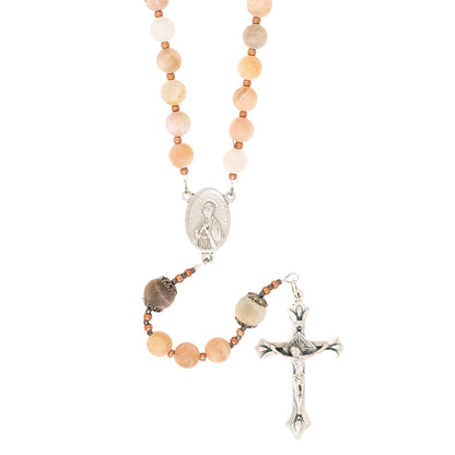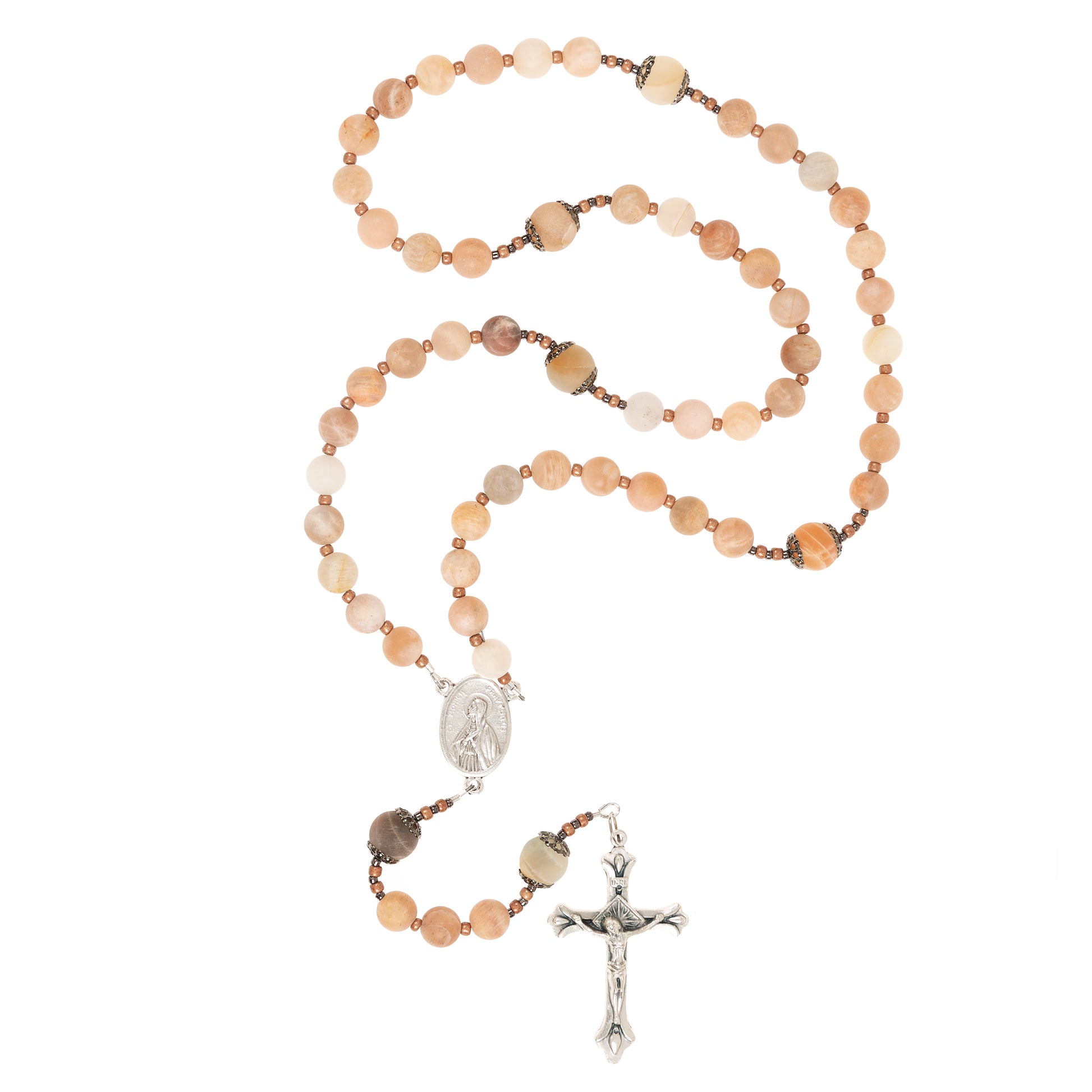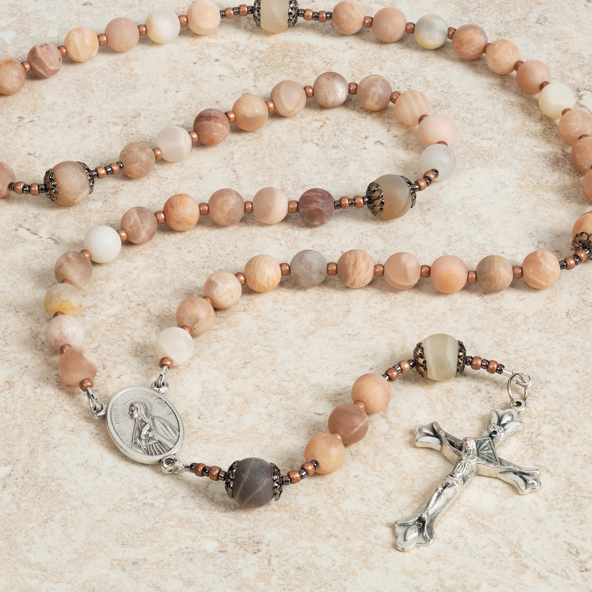 Matte peach moonstone beads* capture the tenderness and simplicity of this great saint. The centerpiece and classic crucifix inspire you unite your petitions and sufferings with Our Lord and St. Monica. A meaningful rosary for anyone laboring to win loved ones back to the Church, or an exquisite token of appreciation for anyone whose prayers and witness have been instrumental in your own faith journey.