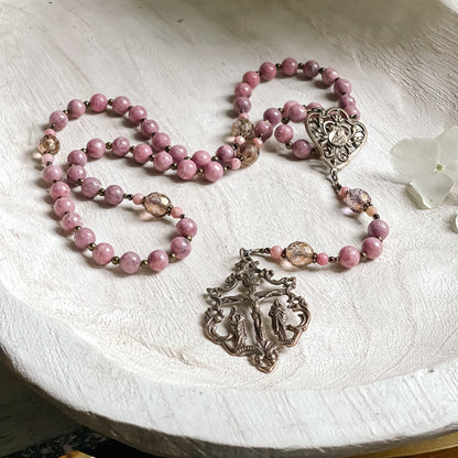 A graceful and distinctive rosary honoring St. Therese the Little Flower, made of rhodonite, long known as a symbol of compassion and love. This fine, hand crafted rosary features dusky rose rhodonite rounds for the Hail Marys, separated by petite antique bronze spacers.