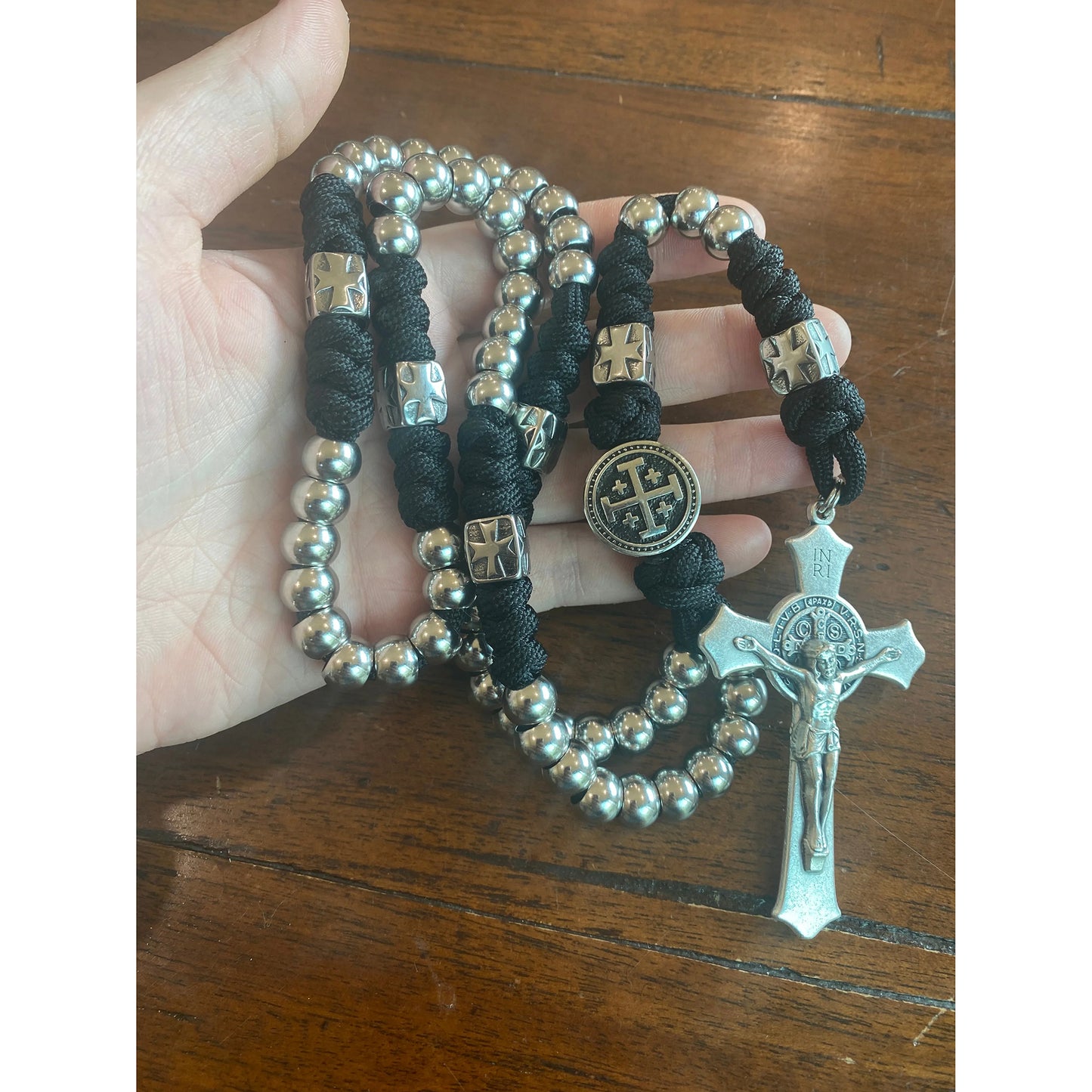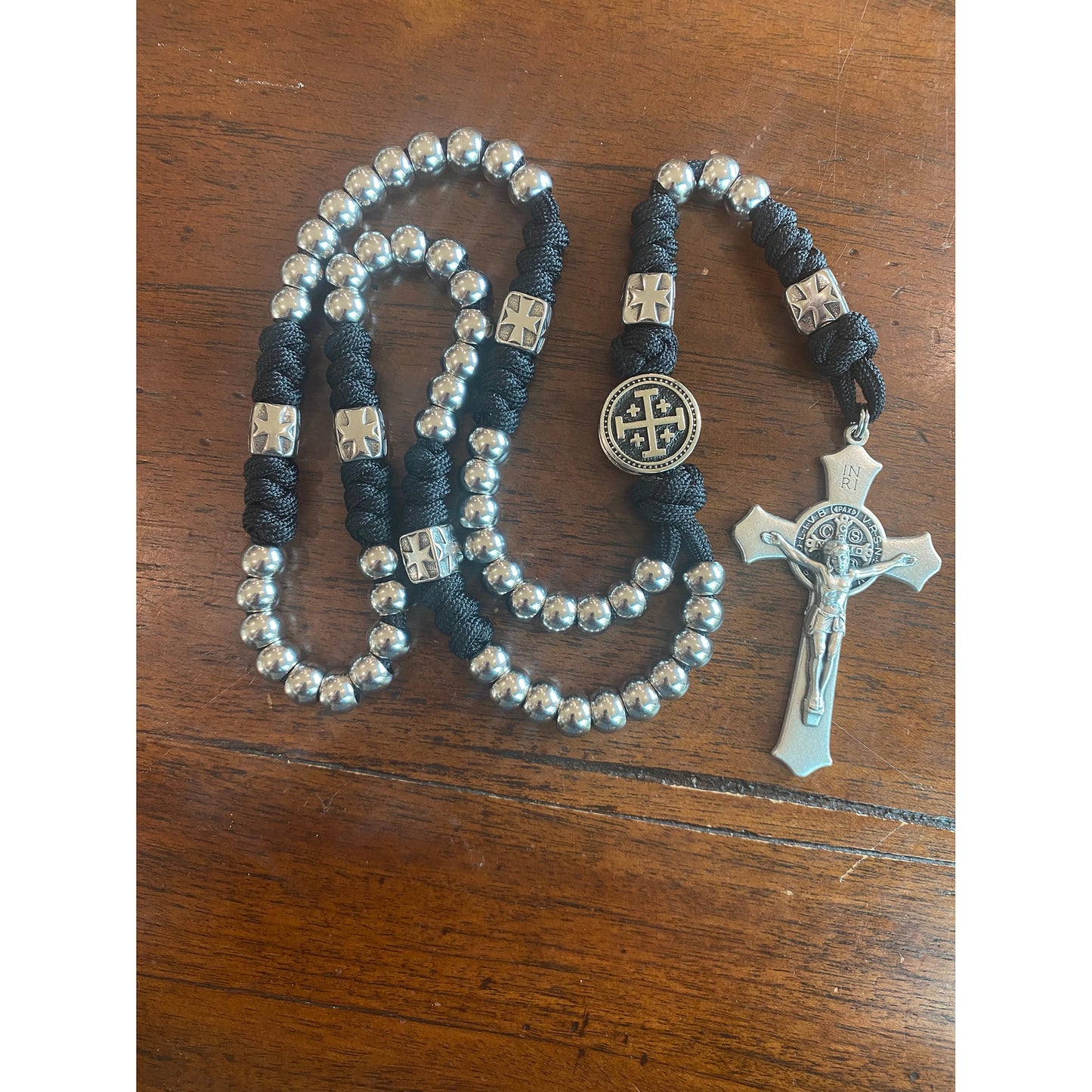 Incredibly strong paracord and round, gleaming silver Hail Mary beads are complimented by substantial Jerusalem Cross sculpted Our Fathers and accented by a distinctive St. Benedict Jubilee Medal centerpiece. The finishing touch is a generously sized St. Benedict Crucifix. A serious sacramental of prayer and protection, and an extraordinary gift. Hand crafted in the USA.