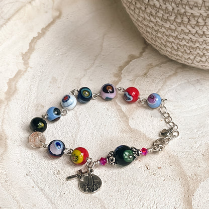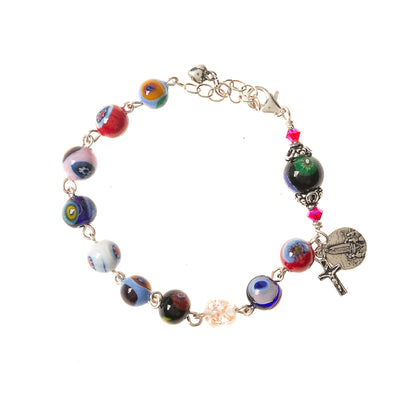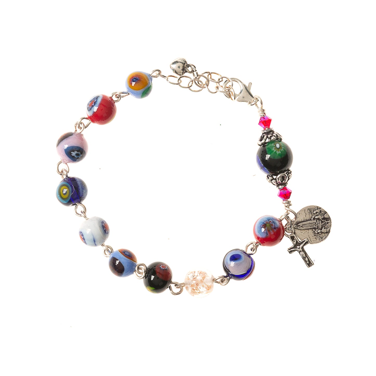 This is a one-of-a-kind rosary bracelet featuring Murano glass beads, famous as individual works of art made in Italy. These distinctive beads have been handmade in Venice by highly skilled master artisans for over 1000 years, and no two are alike. Gold, silver and other precious metals and elements combine to form the brilliant colors. Delicate sterling silver metalwork and airy and open links connect the beads. The finishing touches are a round Marian medal honoring Our Lady of Fatima and simple Crucifix, both in sterling silver. A lobster clasp secures the piece. A short extender allows for personal adjustment, and a bubble heart hangs gracefully on the end. A gift as vibrant and distinctive as her faith, and a one-of-a-kind rosary for her.