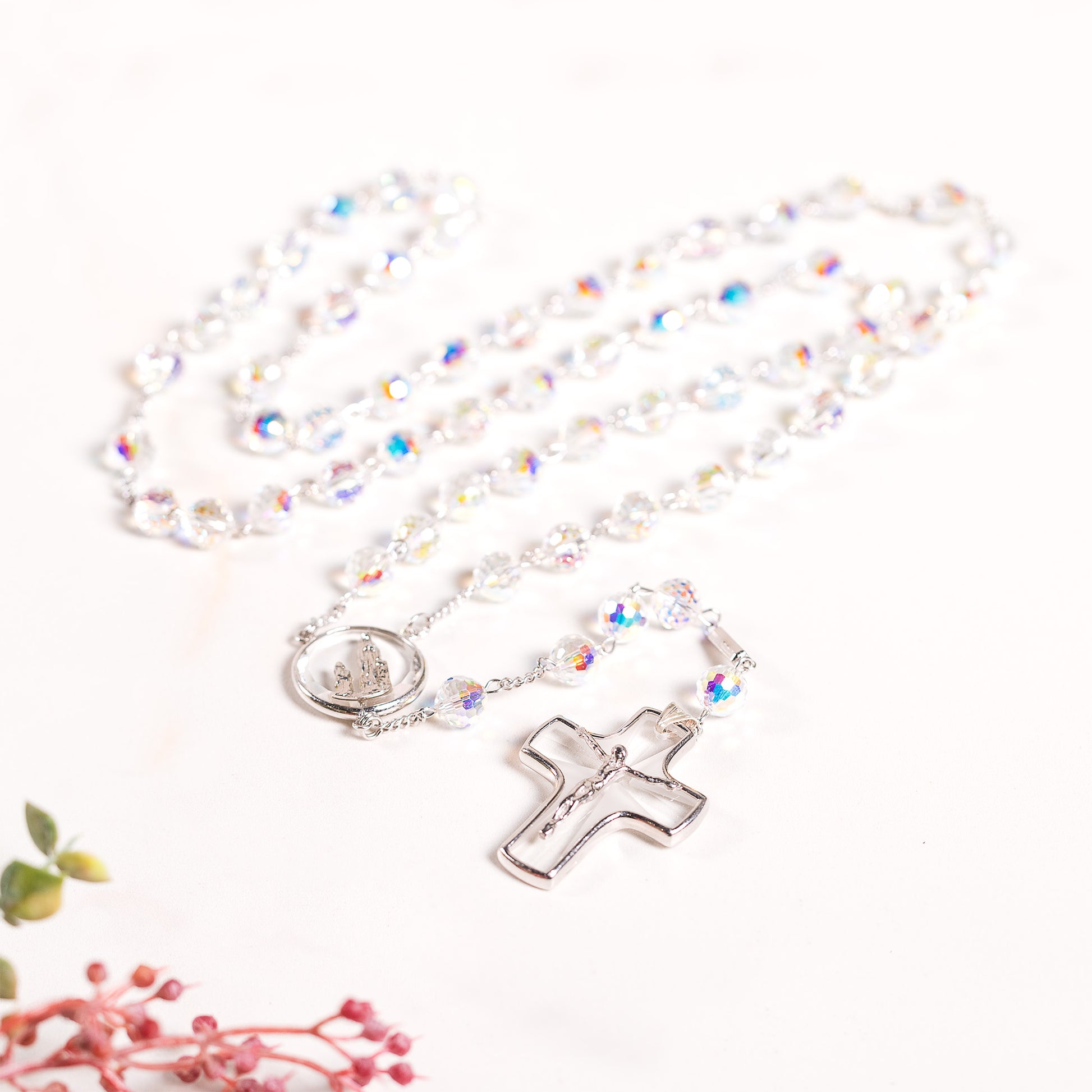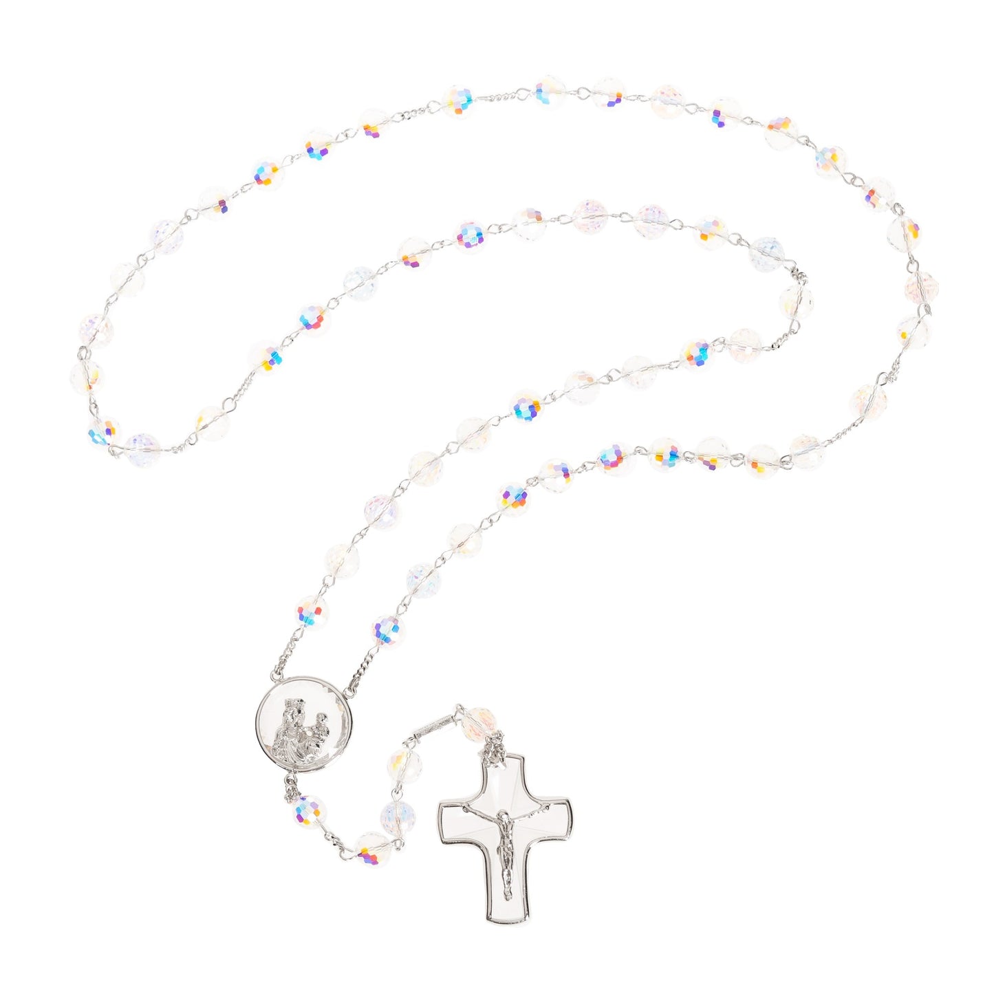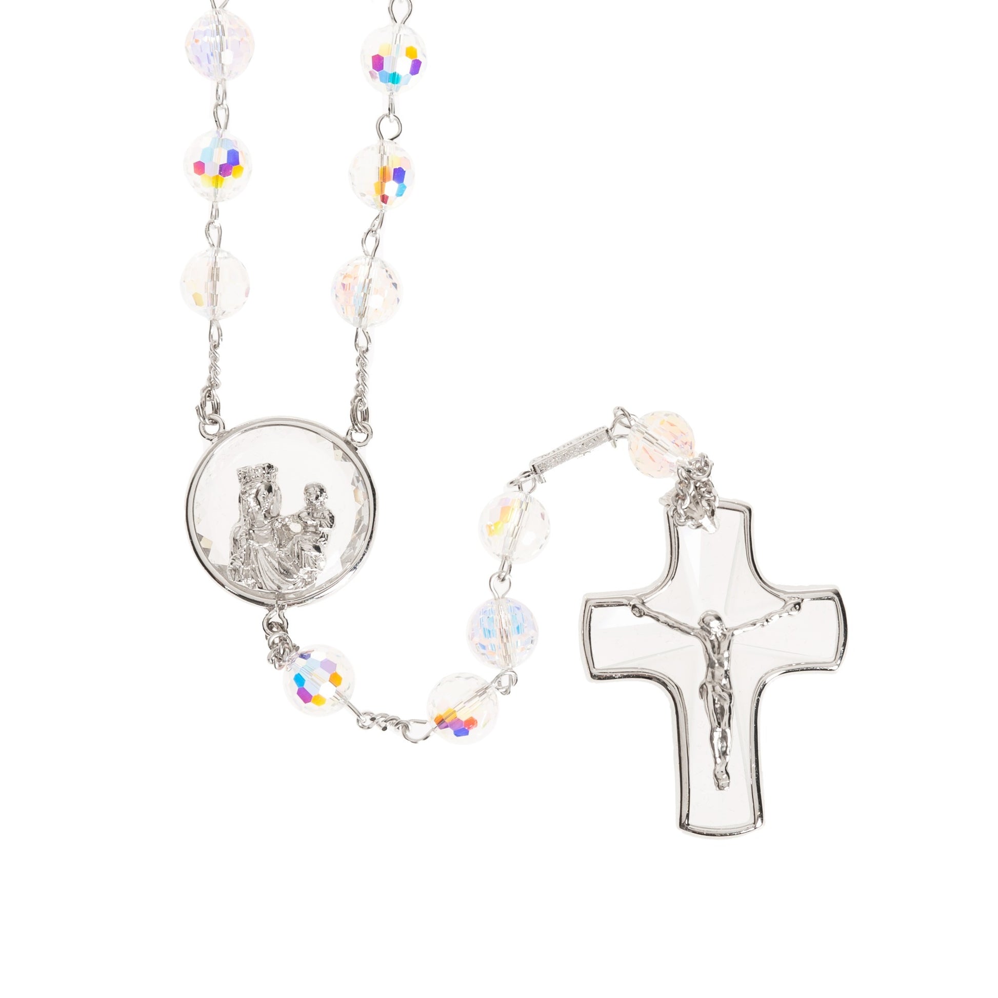Creativity and imagination. Iridescent radiance and artisan craftsmanship. These are the makings of distinctive Ghirelli rosaries, and this one is no exception. Swarovski crystals ablaze with light are cut with an Aurora Borealis glow for incredible sparkle. The method came from a partnership by Manfred Swarovski and Christian Dior, when Dior wanted jewelry that would shimmer with beauty no matter the woman's skin tone. It revolutionized jewelry and haute couture fashion. A coating applied to the crystal sets it afire.