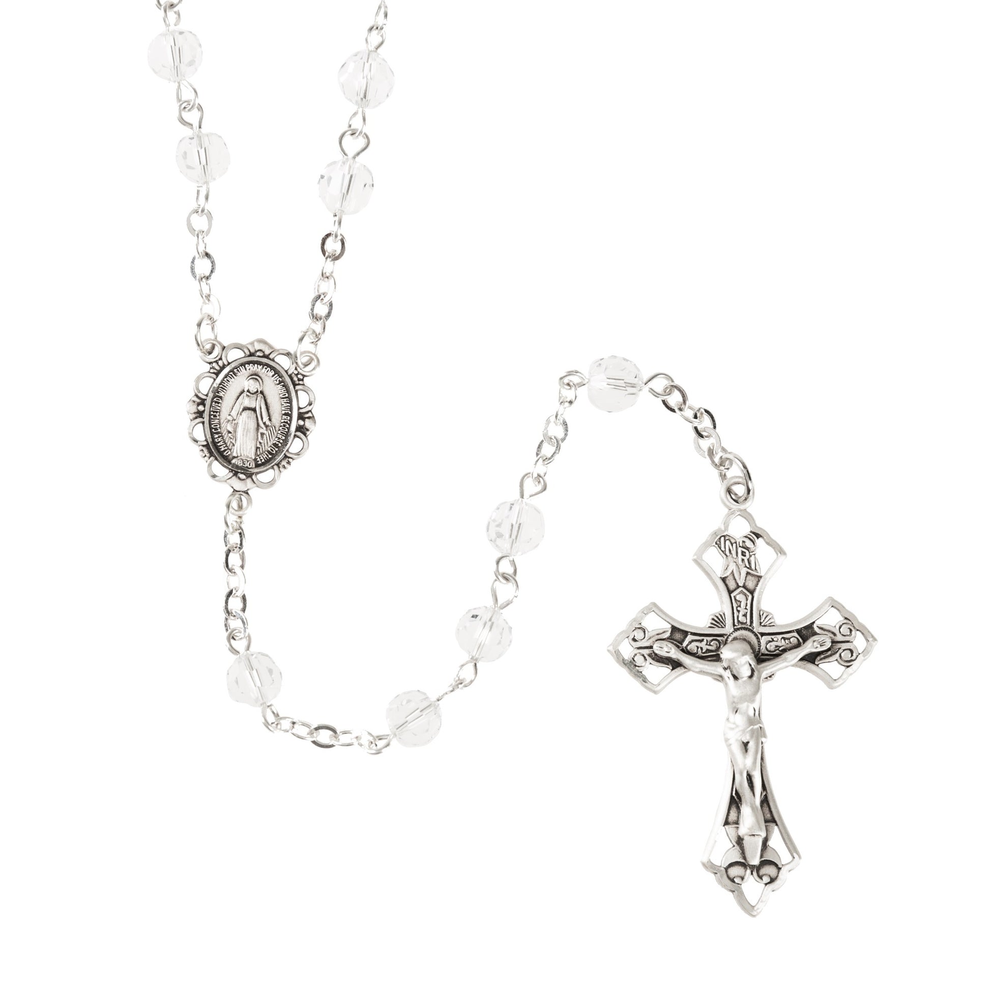 This exquisite rosary, with clear swarovski beads, is a beautiful, traditionally designed aid to prayer. Round Swarovski crystals complement the sterling design, along with a dainty Miraculous Medal centerpiece, and an elegant crucifix. A beautiful and delicate gift that honors Our Lady through her rosary, this is an heirloom that a Catholic lady will treasure forever. Deluxe gift boxed.