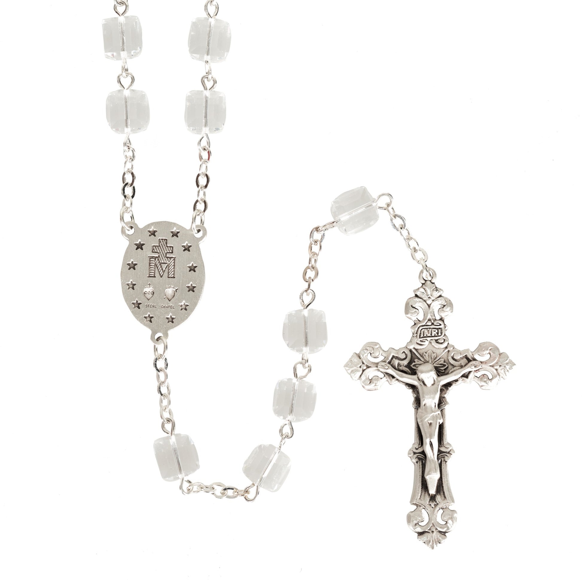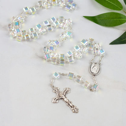 The striking combination of sparkling, cubed beads and gleaming sterling silver allow modern and traditional elements to combine for a gorgeous look that is reverent and distinctive. Aurora Borealis crystals by Swarovski are iridescent and elegant, ablaze with fire and light. The ornate sterling silver Miraculous Medal and the Baroque Crucifix with fleur-de-lis accents add the finishing touches. This is a distinctive fine rosary and an heirloom in the making. A wonderful wedding or anniversary gift. Made in Italy. Deluxe gift boxed.