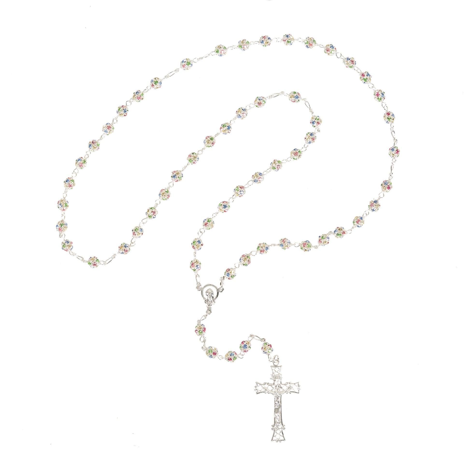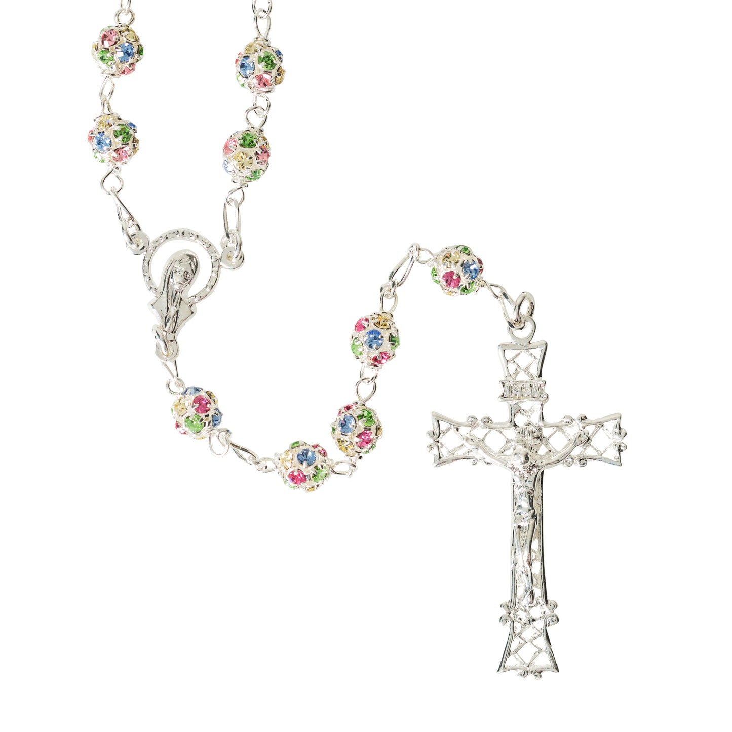 This brilliant rosary is made of Swarovski pave crystal beads, which are set with pastel Swarovski Crystals for an incredible shine. Pastel blue, pink, green, and yellow crystals gleam in the sterling silver setting, which provides ease of care and durability. The Crucifix is intricate, delicately sculpted with hatchwork detailing and the centerpiece is the Madonna with a crystal crown. A brilliant gift for a woman of deep and brilliant faith.