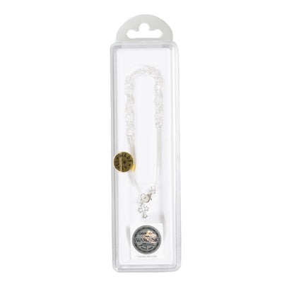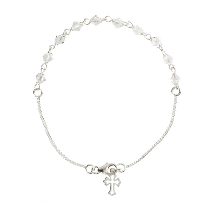 Clear Swarovski crystals sparkle brilliantly against the sterling silver chain of this unique rosary bracelet. The sterling cutout cross adds to the delicate appearance that beautifully accents the outfit of any faithful Catholic woman who loves the rosary, making it a special gift for such a lady which she can wear wherever she goes.