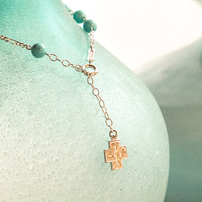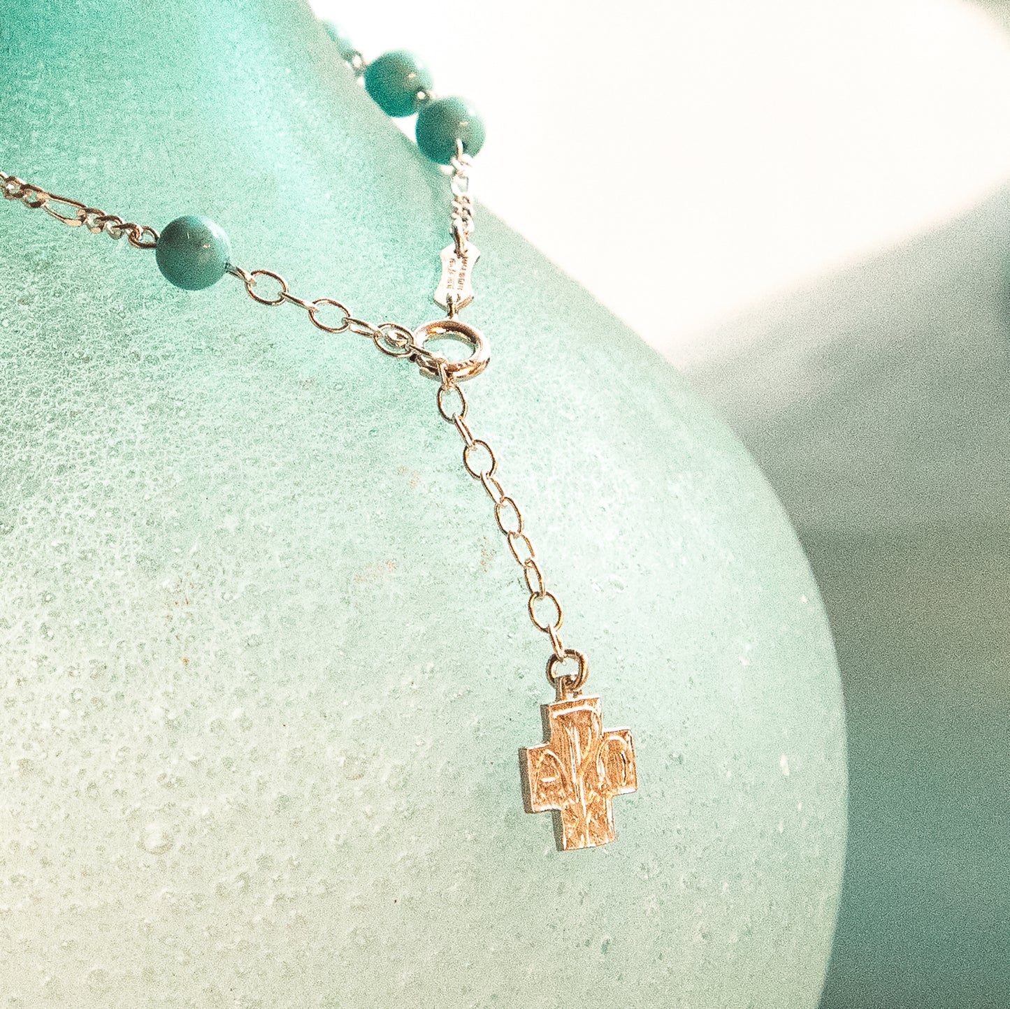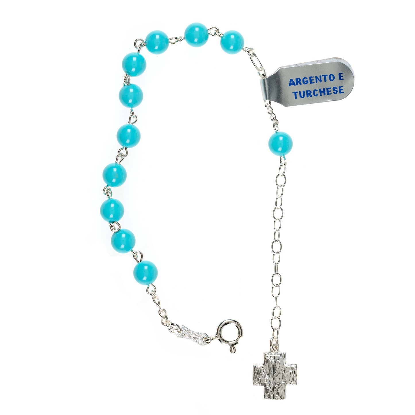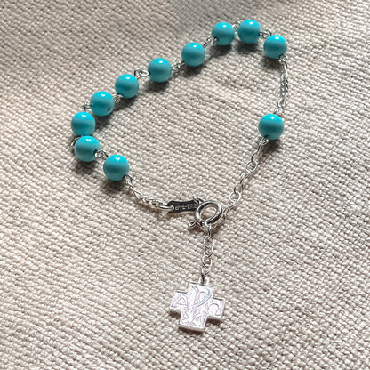 A striking rosary bracelet made of delicate turquoise rounds in pale blue features a contemporary Chi Rho Cross in sterling silver as the finishing touch. A distinctive gift of faith and prayer, it's also a versatile accessory you can wear every day. Wear and share your faith, and take Our Lady's Rosary with you wherever you go. Made in Italy. Note: Personalization, if added, will be engraved on a silver charm attached to the bracelet.