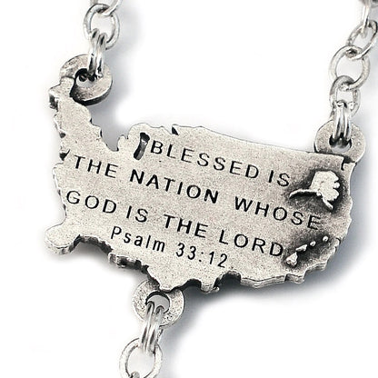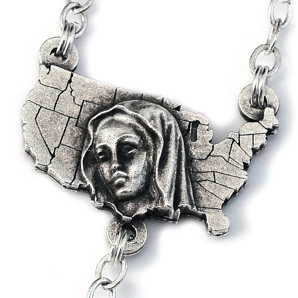 Offer up your prayers for our great nation with this USA Rosary, featuring an incredible USA-themed crucifix. Each of the Hail Mary beads bears the abbreviations of one of the states of the Union, reminding you to offer that prayer for the state, while the centerpiece is shaped like the USA under Our Lady's watchful care. An incredible way to place America under the care of Our Lady, a fantastic gift for a veteran, military family, or any patriot.