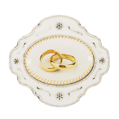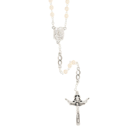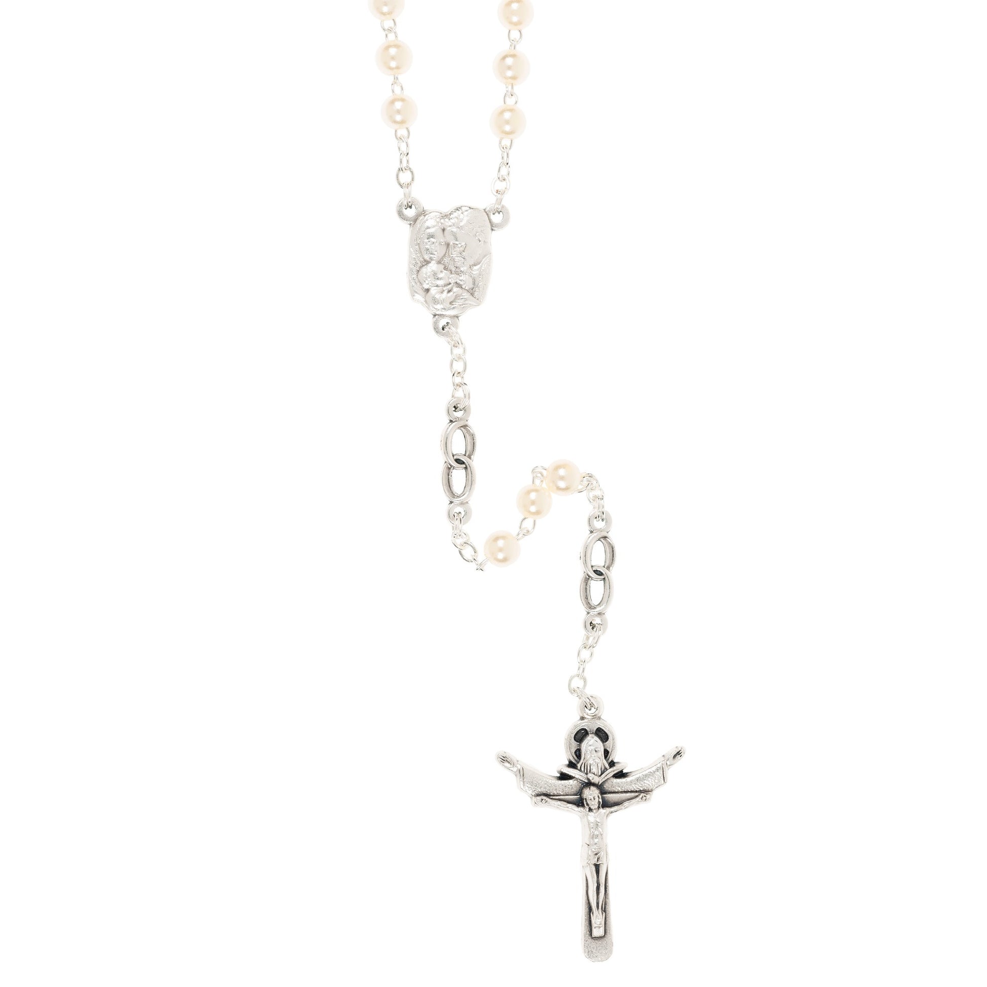 This thoughtfully designed pearl wedding rosary will be a cherished source of devotion for years to come. The unique Tertium Millenium Holy Trinity cross and Holy Family centerpiece invite you to meditate upon the Trinitarian love of God that is the source of strength and unity in marriage. Comes in an ivory gift box with an image of interlocked wedding bands at the center, which complements the Our Father beads. Makes a touching gift for weddings and anniversaries.