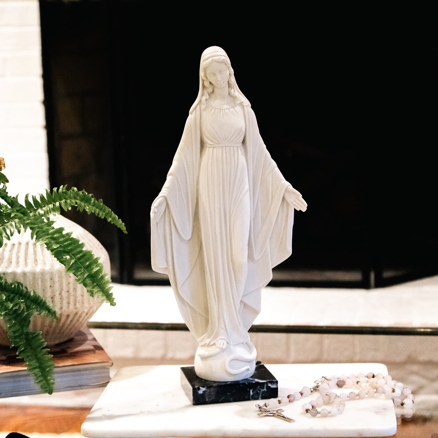 Our Lady of Grace always extends her hands outward to her children to bestow on them the Graces of Her beloved Son. This beautifully crafted statue, made in Italy from high-quality marble, features lovely white hues that inspire a serene and peaceful devotion to Our Blessed Mother. Perfect for any home and makes a wonderful gift.